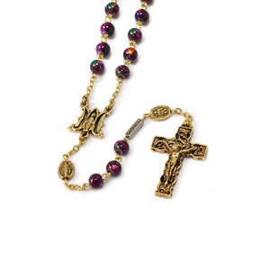6mm glass beads with floral decoration - Gold plated finish with Ghirelli brand plate - Special Our Father beads with 8x6 mm Miraculous Medal metal beads - antique gold plated finish - Centerpiece featuring the two letters “A” and “M” from the Latin “Ave Maria” - Miraculous Medal in the middle - antique gold plated finish - Gothic style crucifix in antique gold plated finish