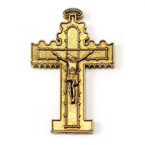 Crucifix: The front image is inspired by the architectural shape of the interior of the Cathedral of Santiago de Compostela -- the end of one's journey. The back of the Crucifix is a miniature rendering of the very large botafumerio, or incense burner, which swings through the soaring Cathedral of Santiago de Compostela and is the highlight of every pilgrim's trip on the Camino.