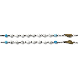 Light blue shaded Bohemian glass beads in 8 mm size and Aulite stones beads in 8 mm size, white with grey veins color. Accented Genuine Murano blown glass in 10 mm size and blue veined-effect satin finish. Learn more about murano glass: (MURANO GLASS: AN ANCIENT ART)