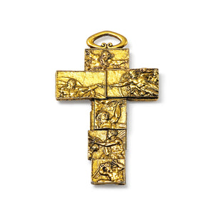 “Sistine Chapel” Cross, with small panels featuring sculptures on both sides, taken from the frescos by Michelangelo. In antique gold plated finish.