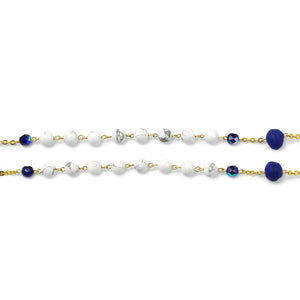 Aulite stones beads in 8 mm size, white with grey veins color. Also includes Bohemian glass faceted beads in 8 mm size and blue color with Aurora Borealis effect. Accented with Genuine Murano blown glass in 10 mm size and blue color veined-effect satin finish. Learn more about murano glass: (MURANO GLASS: AN ANCIENT ART)