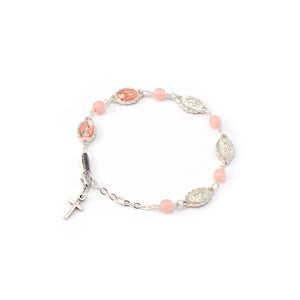 6 mm Bohemian glass beads in new pastel colors alternating with medals of the "Fatima Apparition", polished silver plated finish with hand-enameled inserts.