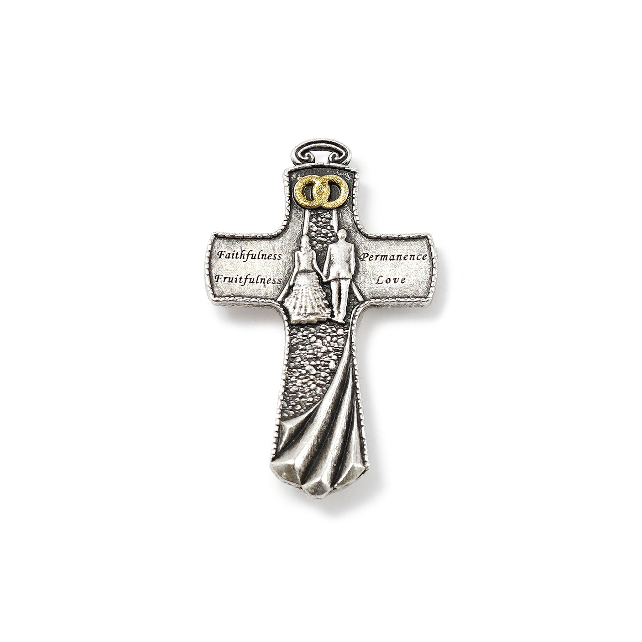 An original Ghirelli® design depicts the sacrificial love Jesus is giving to all the faithful, especially those joined together in Holy Matrimony. On the back, an image of the newlywed couple holding hands continuing along the path that leads them to the altar.