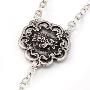 Centerpiece in antique silver plated finish featuring Mary maternally embracing Jesus within an artistic frame;