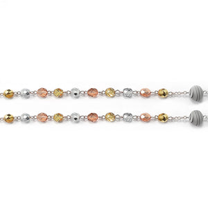 Beads: Bohemian glass faceted beads in 8 mm size, with alternating mirror/reflective effect in the colors: pink gold, silver and gold. Genuine Murano blown glass in 10 mm size and satin grey color with veined-effect