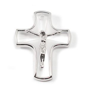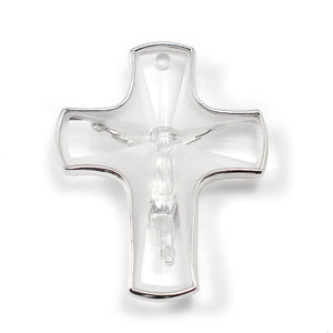 - Hand-made crucifix with cross-shaped Crystal pendant hand-set on a 925/°°° Sterling Silver structure thick rhodium plated, in the middle Body of Jesus in 925/°°° Sterling Silver, thick rhodium plated