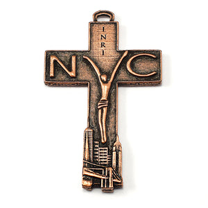 Crucifix: A unique and exclusive design dedicated to New York City. The arms of Christ rising from the skyline of the city take part in the initials "NYC". A unique treatment of the memory of the Twin Towers appears on the back.Finish: Antique silver. Antique Copper Components