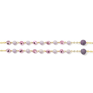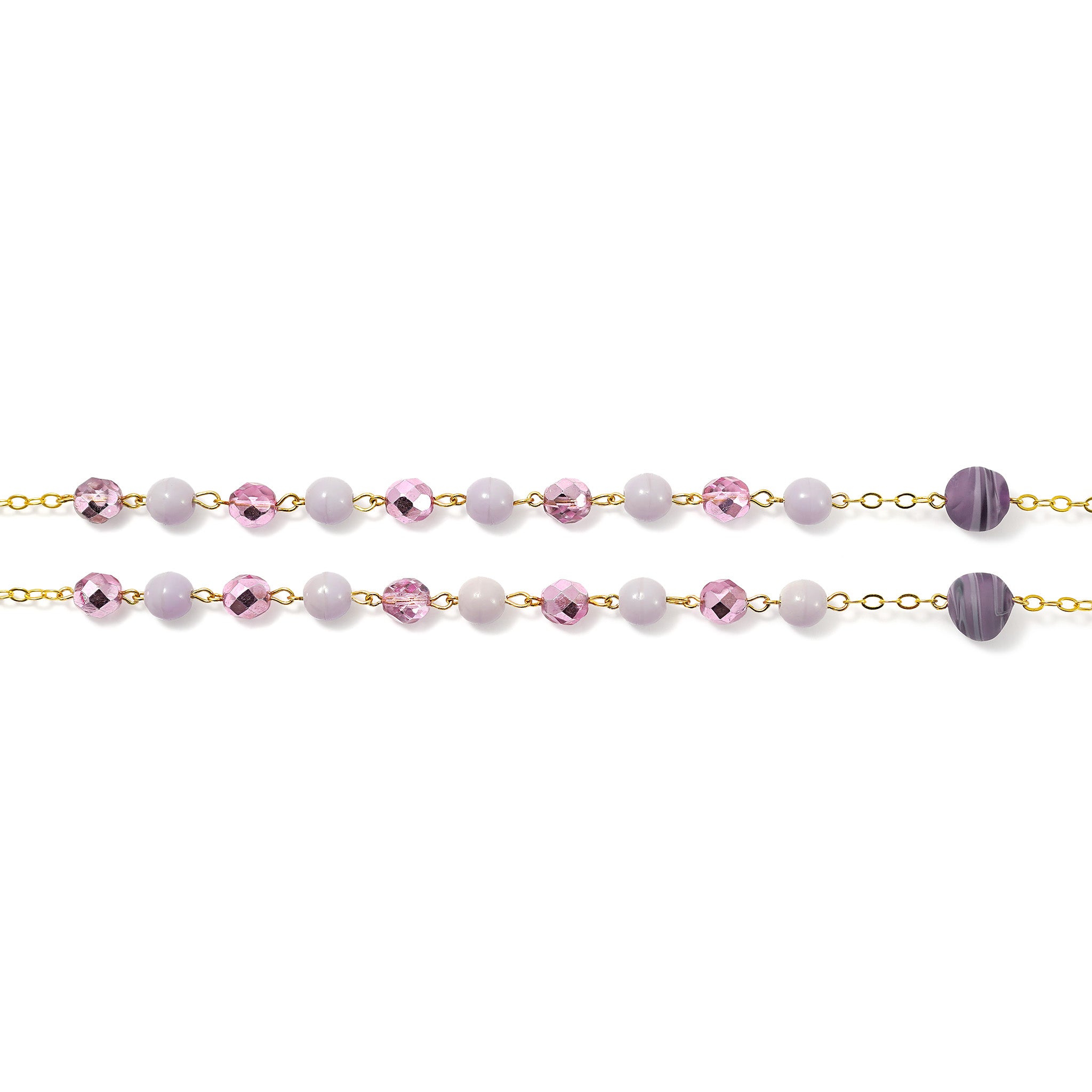 Pressed Bohemian glass beads in 8 mm size and lilac pastel color. Also with faceted Bohemian glass beads in 8 mm size and translucent/mirror effect in fuchsia color and Genuine Murano blown glass accent beads in 10 mm size with purple veined-color and satin finish. Learn more about murano glass:Â (MURANO GLASS: AN ANCIENT ART)