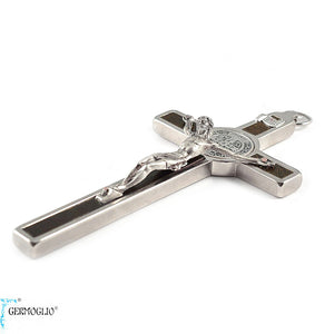 This Saint Benedict Crucifix Wall Cross is made of steel with a silver plated finish. The Saint Benedict Medal and Body of Christ are made from solid brass and plated in a silver finish, and accented with genuine Italian wood inlay on the front.