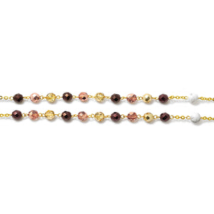 Faceted Bohemian glass in 8 mm size with alternating mirror/reflective effect in the colors: rose, gold, and copper. Aulite stones beads in 8 mm size, white with grey veins color.