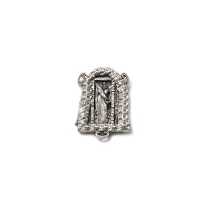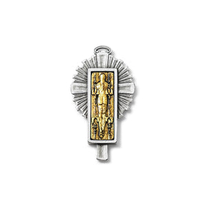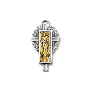 Front and back reproduction of the Holy Shroud with artistic perfection of detail. Unique and original design characterized by the overlap of two separate elements in two contrasting finishes – antique silver and antique gold.