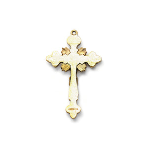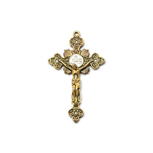 Eucharistic Ostensory crucifix with hand-enameled Host inspired by the Real Presence of Jesus in the Most Sacred Eucharist and by the Gospel passage "I am with you always” Matthew 28:20, antique gold plated finish