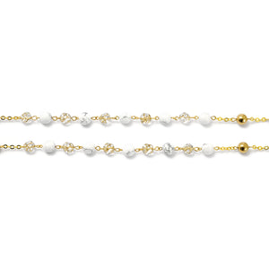 Aulite stones beads in 8 mm size, white with grey veins color. Bohemian glass 8 mm with an elegant round spiral shape, transparent color with golden. Bronze color hematite in polished finish, in 8mm size.