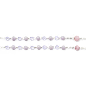 Pressed Bohemian glass beads in 8 mm size and lilac pastel color, alternating Bohemian glass faceted 8 mm size beads in lilac color. Genuine Murano blown glass accent beads in 10 mm size with a satin finish in veneered lilac color. Learn more about murano glass:(MURANO GLASS: AN ANCIENT ART)