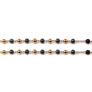 Beads: Hematite natural stone in 8 mm size and alternating in gunmetal polish finish and copper polish finish beads, with black agate accent Our Father natural stone bead in 8 mm size and satin finish