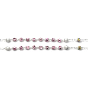 Aulite stones beads in 8 mm size, white with grey veins color. With faceted Bohemian glass beads in 8 mm size and fuchsia color with translucent/mirror effect. Accented with hand-decorated 8mm Lumen Beads.