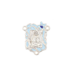 - Centerpiece in polished silver plated finish featuring bust of the Immaculate Conception among artistic decor with lily and hand-enameled inserts
