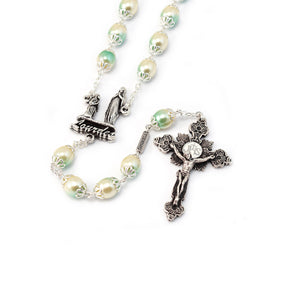 8 mm Bohemian glass beads, two-tone pearly finish - Silver plated finish with caps and Ghirelli brand plate - Centerpiece in the shape of a three-dimensional sculpture of the Lourdes Apparition - antique silver plated finish - Eucharistic Ostensory crucifix with hand-enameled Host inspired by the Real Presence of Jesus in the Most Sacred Eucharist and by the Gospel passage "I am with you always” Matthew 28:20, antique silver plated finish.