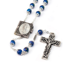 8 mm glass beads with floral decoration - Silver plated finish with caps and Ghirelli brand plate - Centerpiece – two-tone booklet – antique silver and polished silver plated finish – containing the four Mysteries of the Holy Rosary - Gothic style crucifix in antique silver plated finish