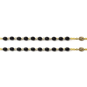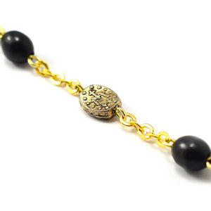 Beads: Italian wood oval in 6x8 mm size and black color. Paters depict the Miraculous Medal in metal and 8x6 mm size in antique gold finish
