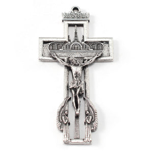 Crucifix: Created for the occasion of the 160th Anniversary of the Apparition at Lourdes, the Crucifix is a unique masterpiece full of meaningful details. Above the imposing Basilica facade there appears a precious crown -- symbolizing the royalty of the Immaculate Conception. At the center Jesus the Eucharist, present in the Ostensory, adored by the Angels.