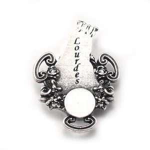 Centerpiece: A beautiful representation of the Crowned Immaculate surrounded by buds of Roses buds and in the center a clear reservoir containing Authentic Lourdes Water.