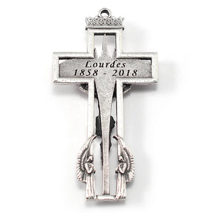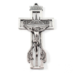 Crucifix: Created for the occasion of the 160th Anniversary of the Apparition at Lourdes, the Crucifix is a unique masterpiece full of meaningful details. Above the imposing Basilica facade there appears a precious crown -- symbolizing the royalty of the Immaculate Conception. At the center Jesus the Eucharist, present in the Ostensory, adored by the Angels