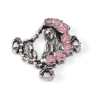 Centerpiece: Inspired by the famous Apparition of Lourdes, this image depicts Our Lady inside the Grotto surrounded by a unique hand enameled treatment of rosebuds in pink color, with the Immaculate and St. Bernadette in the center.