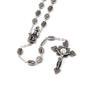 - 8x6 mm metal beads featuring “Our Lady of the Rosary,” rosebuds on the reverse side, antique silver plated finish