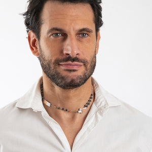 ROSALET® NECKLACE SQUARE POLISHED HEMATITE BEADS, STERLING SILVER & ROSE GOLD PATER