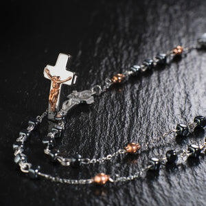 The look and comfort of a traditional Rosary, the iconic Cross-Closure, the charm and elegance of a one-of-a-kind jeweled necklace.