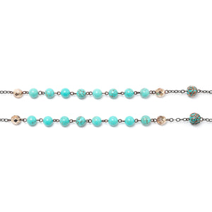Bohemian glass faceted beads in 8 mm size and rose color with mirror/reflective effect. Aulite Turquoise stones beads in 8 mm size, and accented with hand-decorated 8 mm Lumen Beads.