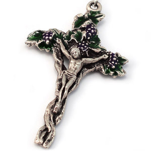 - Crucifix inspired by the Gospel passage “I am the vine; you are the branches” John 15:5 antique silver plated finish with hand-enameled grapes and leaves