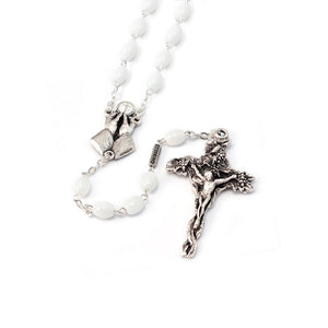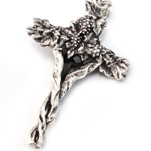7x5 mm glass beads - Silver plated finish with Ghirelli brand plate - Centerpiece “Consecrating Hands” with hand-decorated Host with white enamel, antique silver plated finish - Crucifix inspired by the Gospel passage “I am the vine; you are the branches” John 15:5 with grapes and leaves antique silver plated finish