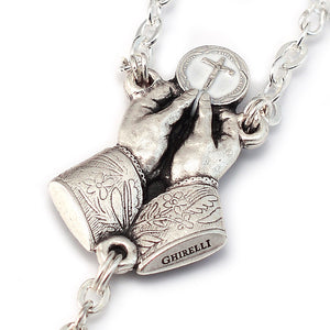 7x5 mm glass beads - Silver plated finish with Ghirelli brand plate - Centerpiece āConsecrating Handsā with hand-decorated Host with white enamel, antique silver plated finish - Crucifix inspired by the Gospel passage āI am the vine; you are the branchesā John 15:5 with grapes and leaves antique silver plated finish