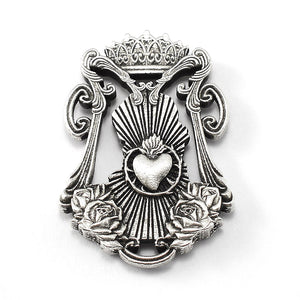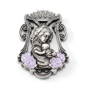 Centerpiece: An original "M" icon surmounted by a royal crown frames a splendid portrait of the Madonna with Child Jesus adorned with rosebuds