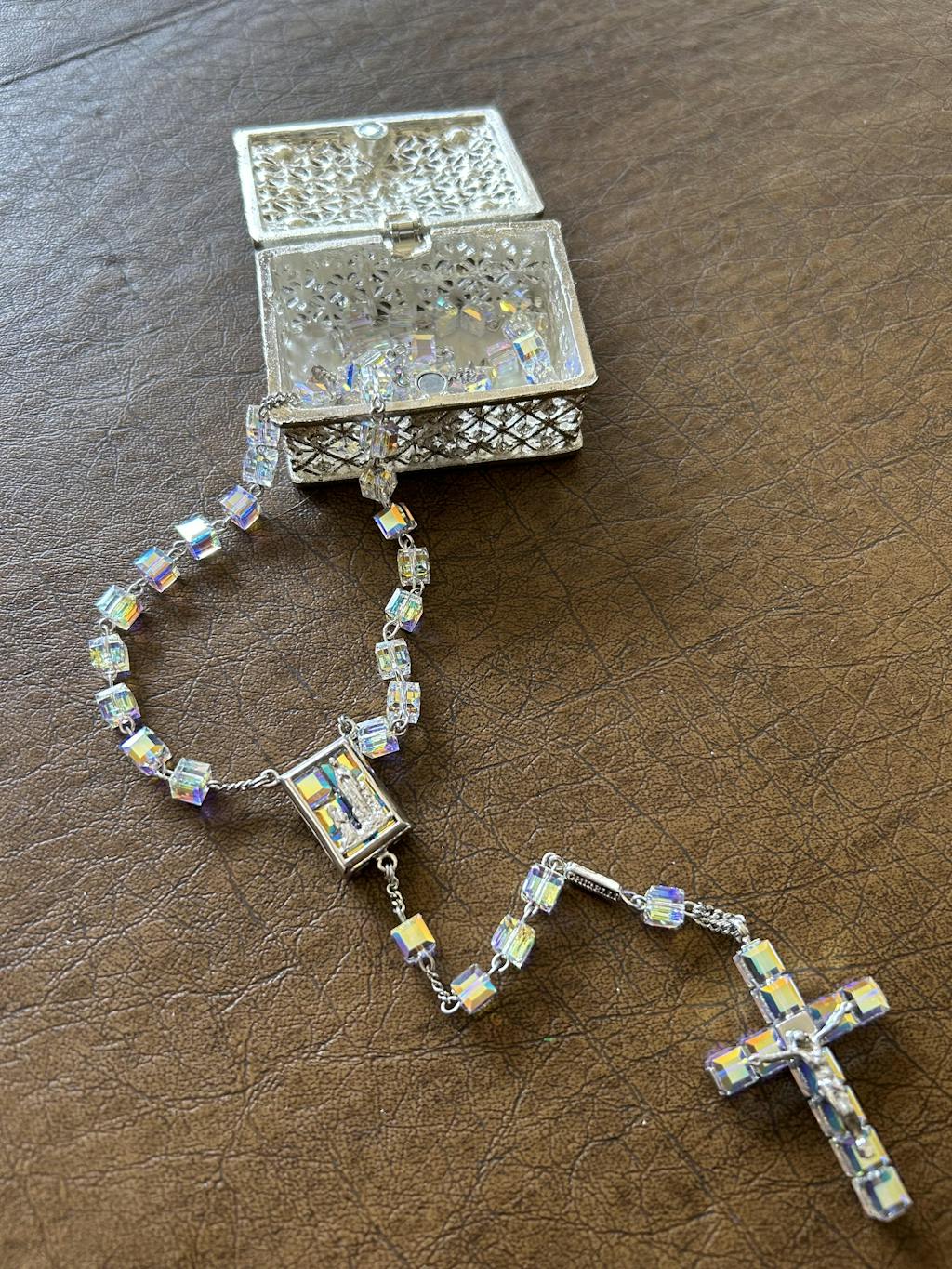The Crystal Element is the absolute protagonist of these models. A series of settings produces original forms and effects. The perfection of the Crystal, made from .925 pure sterling silver, shines in the Crucifix and the Centerpiece. Gold or rhodium finishes give the Aurora Borealis Collection rosary the perfection of a jewel.