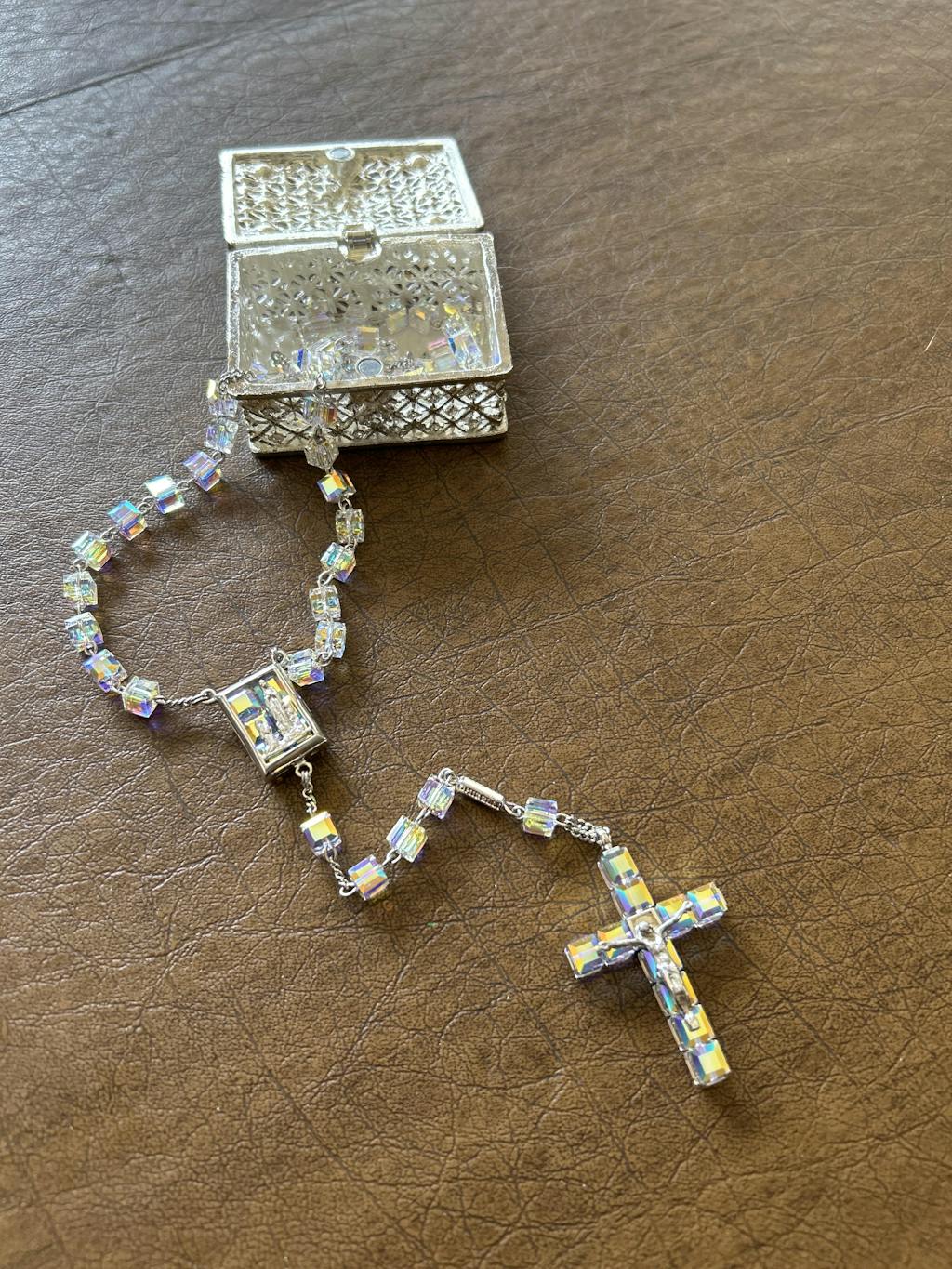 - Hand-made centerpiece with 6 mm Crystal cube beads hand-set on a 925/°°° Sterling Silver structure thick rhodium plated, in the middle reproduction of the Lourdes Apparition in 925/°°° Sterling Silver thick rhodium plated