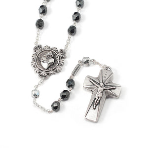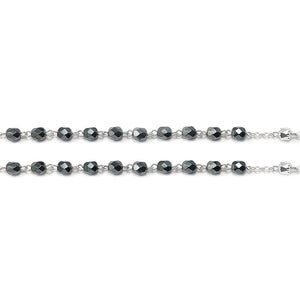 Beads: Faceted Bohemian glass beads in 7 mm size and Hematite color. With accent Bohemian glass cut Cathedral Bead in 6 mm size and polished silver color