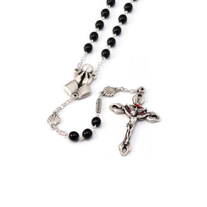 6 mm glass beads - “Baptism” Our Father beads in shape of small shells with antique silver plated finish - Silver plated finish with Ghirelli brand plate - Centerpiece “Consecrating Hands” with hand-decorated Host with white enamel, antique silver plated finish - Crucifix with “Dove of the Holy Spirit”, surrounded by rays, hand-enameled inserts, antique silver plated finish. This Rosary is presented in our exclusive Made-in-Italy hard box with its unique design and accurate details expressing the unmistakable Ghirelli style. The logo on the front of the box appears in relief.