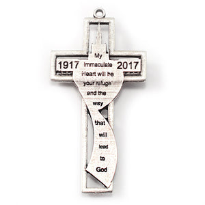 Crucifix: characterized by the "Via" --  the Way, or path that leads to the refuge of the Immaculate Heart of Mary. The Crucifix embodies the words of Our Lady “My Immaculate Heart will be your refuge and the way that will lead you to God”.  We have chosen to symbolically place the three little shepherds as the first to travel the "Via" and walk on the path so clearly indicated by Our Lady. The top part of the Crucifix takes shape from the actual colonnaded Basilica at Fatima in Portugal. When the Basilica is viewed from the front it actually looks like a cross. This is Fatima -- the shining place of grace -- chosen in God's plan for the Apparitions of Our Lady.