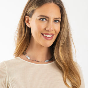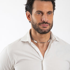 ROSALET® NECKLACE SQUARE MATTE HEMATITE BEADS, STERLING SILVER & ROUND PATER