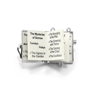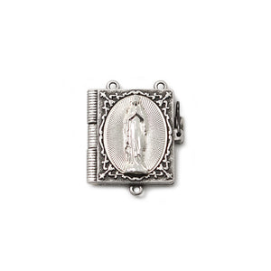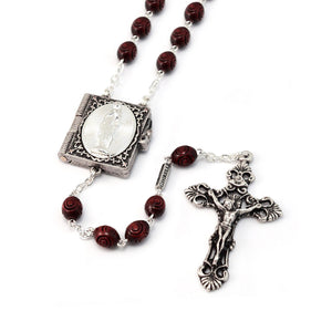 Italian wood rosary honors Our Lady of Lourdes and includes 8x7 mm wood beads, with antique silver plated finish and Ghirelli brand plate. The Centerpiece features a booklet that can open, and contains the four Mysteries of the Holy Rosary. Two-tone finish with black inlay accentuates the amazing detail. The Baroque style Crucifix is stunning and available in antique and polished silver plated finish.